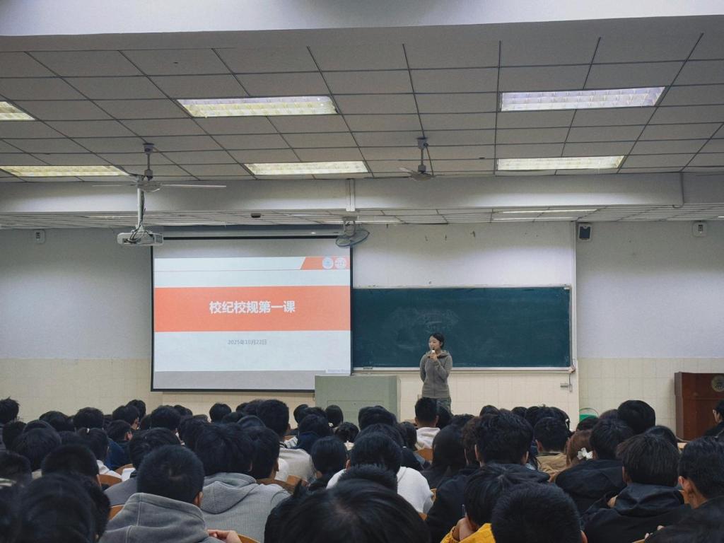 为强化新生纪律意识,规范在校行为,h漫 于10月22日在阶教201举行2025级新生“校纪校规第一课”。辅导员李思雨担任主讲,全体2025级新生参加。
