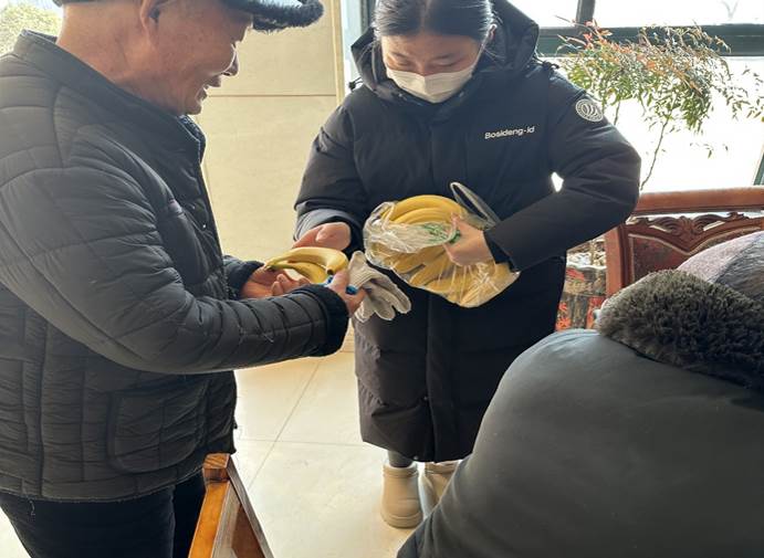 图为实践队员为老人们分发自购的香蕉。 通讯员 姚敏敏 摄