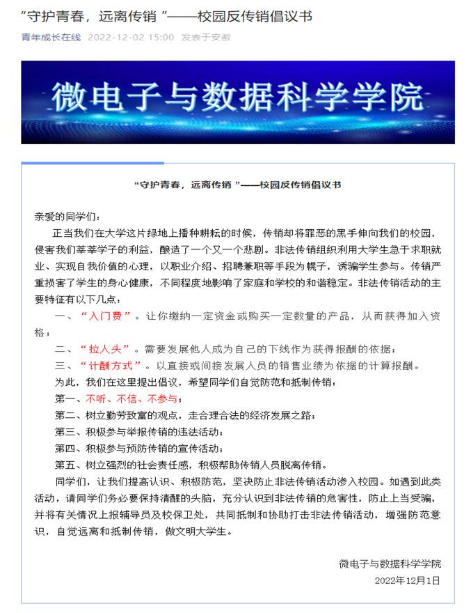 开展了“守护青春,远离传销”校园防范传销宣传教育活动。本次活动由校学生工作部(处)、校团委、安全保卫部(处)主办,h漫