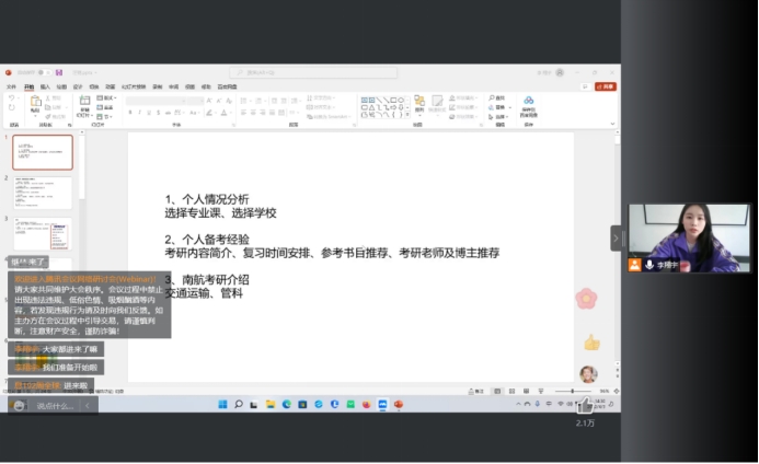 4月3日,管工学院举办了线上考研经验交流会,选取了工业工程、工程造价、物流工程和信息管理与信息系统专业6名优秀学生代表进行宣讲,宣讲人分别为东南大学、中国矿业大学、南京航空航天大学、合肥工业大学、武汉理工大学、大连海事大学2022年拟录取硕士研究生。