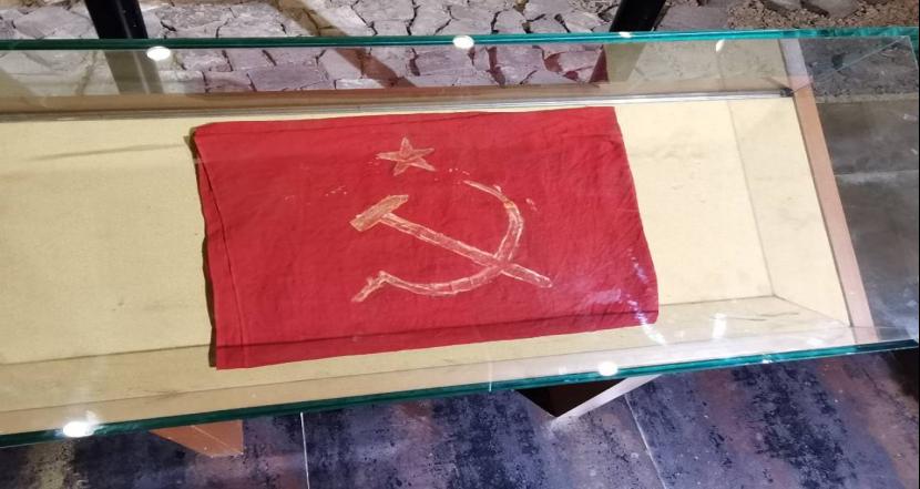 图为纪念馆陈列的早期中国共产党党旗图案。