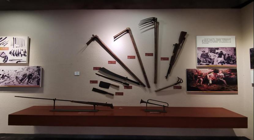 图为革命时期农民及党员所用的锄具、枪支等。