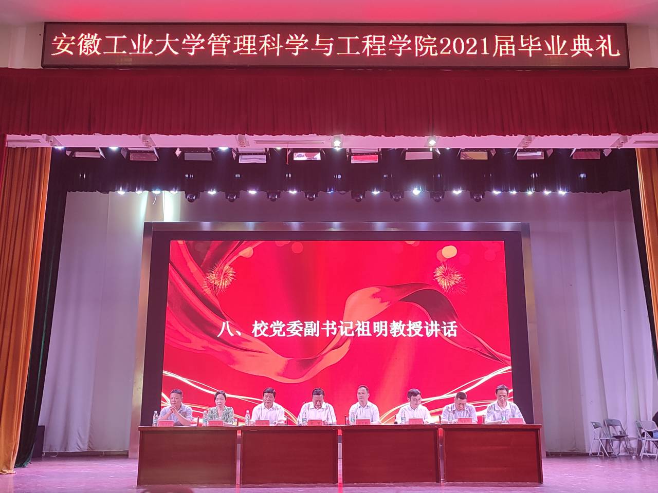 校党委副书记祖明做总结讲话。他向毕业生们表以最诚挚的祝贺与祝愿,向为学生培养作出贡献的各界力量表示感谢,介绍了学校四年的发展成果,肯定了管工学院、管工学子四年间的发展成绩。他强调,今年的毕业季恰逢中国共产党成立100周年,广大青年生逢盛世,要深入社会,不惧挑战,做勇敢者,要坚持学习,不断实践,做奋斗者,要修身立德,择善而从,做奉献者,努力成长为能够担当民族复兴大任的时代新人。最后他希望,广大毕业生要与母校相互关心,互相支持,共同成长,共同发展。