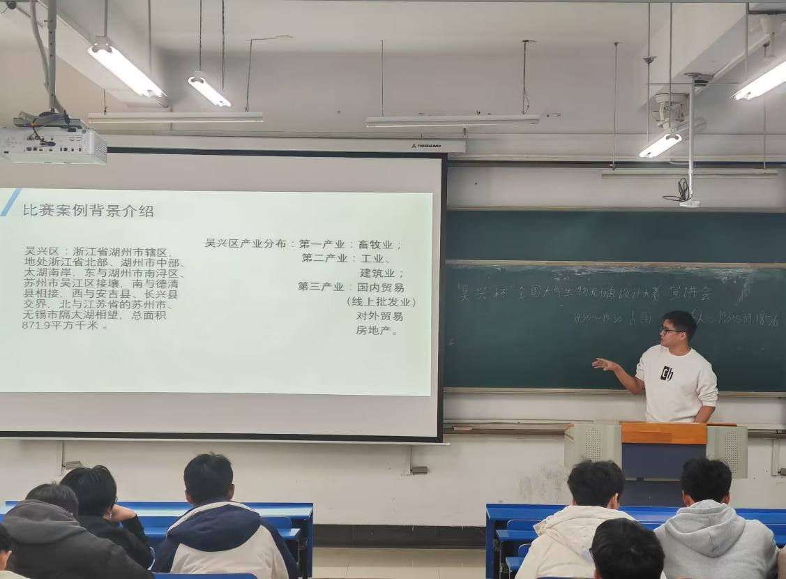 在教D207举办“新青年吴兴杯”第九届全国大学生物流设计大赛专题宣讲会。活动由物流思创园协会负责同学杨乐担任主讲。