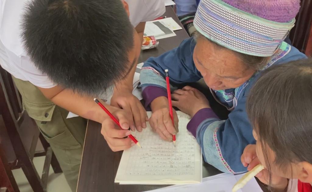 “我叫王介妹。”“我是韦四妹……”,村民们在课堂上认真的练习着。实践队员们也在他们身旁帮忙纠正发音,根据他们的需求向他们教授不同情况下的普通话使用。推普的工作顺利进行着,队员们不仅教授村民们普通话,还教村民们如何用汉字写自己的名字。村民们从最开始的拘谨,到后来大胆与实践队队员们用普通话沟通,大家像一家人一样坐在一起交流谈论,课堂氛围和谐温馨。