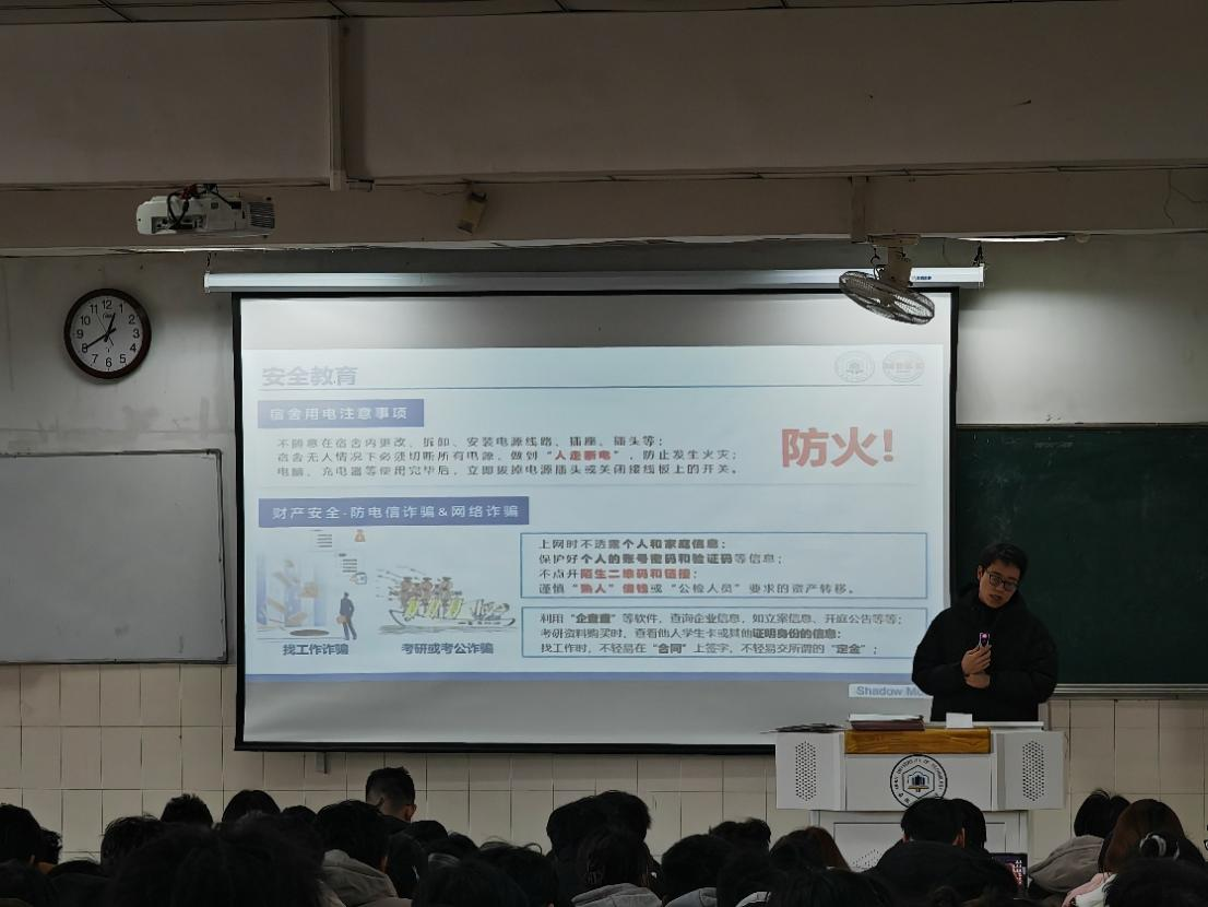 曹宇围绕网络安全、人身财产安全、消防安全等多方面开展宣传教育,结合校内外典型安全案例,剖析当前存在的各类风险隐患。他强调要重点防范网络诈骗,提醒同学们安全无小事,必须时刻保持警惕,将安全意识融入日常、化为行动,做到不刷单、不投资、不点陌生链接、文明交友,守护好个人隐私与财产安全。最后,钱丹丹提醒全体同学加强宿舍安全隐患排查和晚间零汇报、各班级主要负责人做好督促和跟进,保证班级安全管理全覆盖、落实处。