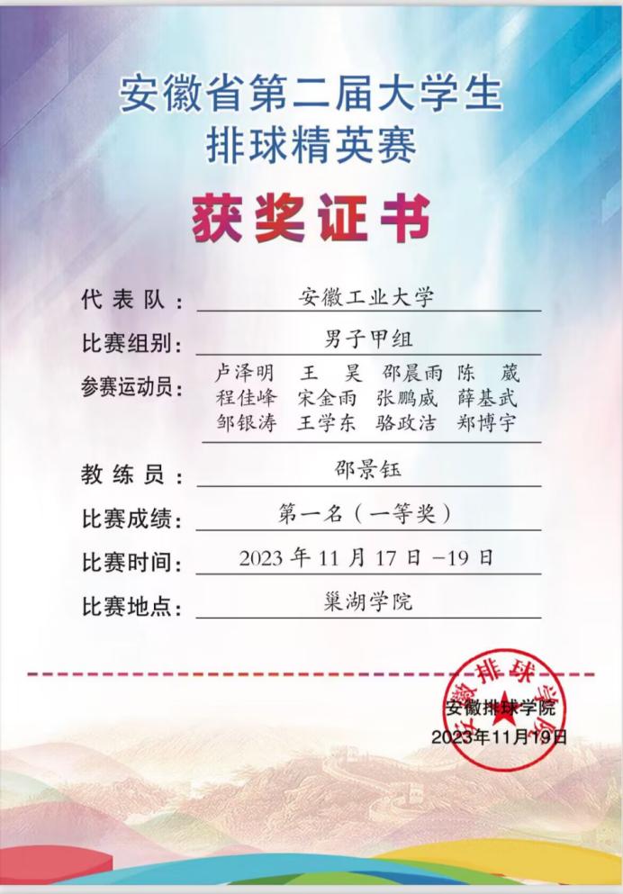 邵晨雨、程佳峰、宋金雨、骆政洁、郑博宇5位同学随校队出行,并获得安徽省第二届排球精英赛男子甲组第一名的好成绩。