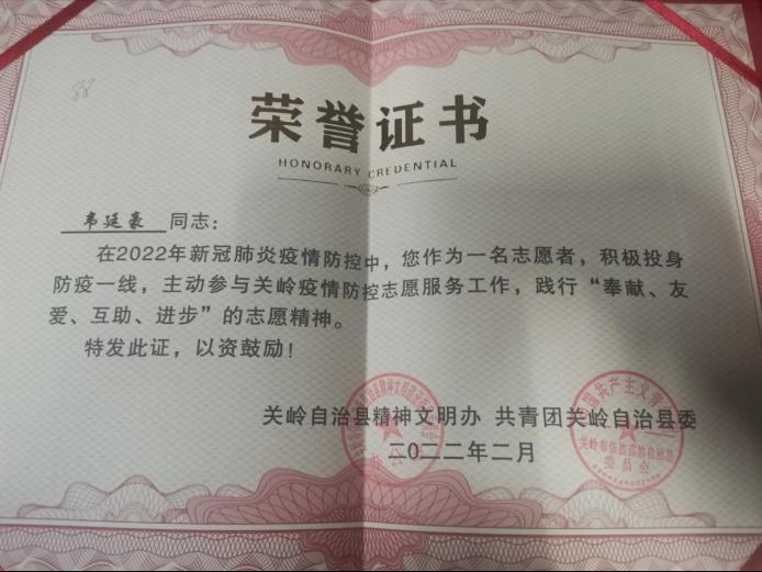 “我们从1月30日到正月初八,每天在街道上都要站至少四个小时,30号那天我们站了八小时,回家的时候能感觉到手脚已经冻僵了。”接到任务以后,韦廷豪被分配在关岭布依族苗族自治县高速公路收费站负责查看每一辆车上人员的健康码、行程码、核酸检测结果并对其进行体温监测,如果遇到不符合情况的人员还需要登记引导其现场进行核酸检测。一手抓卡点防外输,一手抓核酸采样登记,在寒风凛冽中,他与其他志愿者们紧密配合,保护家乡,数九寒冬冲不散的是管工学子身上的一腔热忱。“作为当代大学生,我本就应该不畏艰险冲锋在最前线,我相信通过我们的努力,我的家乡一定能够平安度过此次难关。”志愿者韦廷豪说。