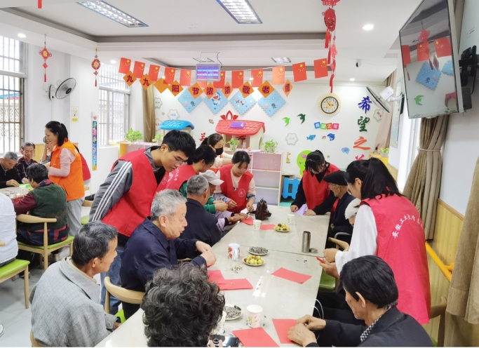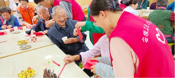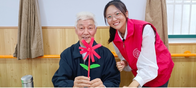 折纸。文艺演出结束后,志愿者与老人们共同制作了手工折纸。志愿者将提前准备好的材料分配好后,便耐心地教老人们折纸。过程中,志愿者向老人们分享着自己精彩纷呈的大学生活。在温声细语中,通过老人们和志愿者的合作,一朵朵纸菊花完成了,表达了志愿者们对老人们重阳节满满的敬意和祝福。
