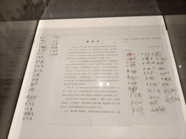 古有大禹治水三过家门而不入,今有沈浩选派六载忠魂留小岗。沈浩同志先进事迹陈列馆内陈列了沈浩生前在小岗村经常穿着的沾满小岗村泥土的皮鞋、用过的电脑、工作日记等大量珍贵实物。看到这些,实践队员们表示:基层工作者们不畏艰苦,在恶劣的环境中一直在发光发热,用自己的行动带动贫困地区的发展,是青年一代的榜样。来到主展厅,这里展示了沈浩在小岗村的工作经历和取得的主要成绩。2004年2月,作为优秀的青年党员干部,沈浩积极响应安徽省委号召,作为全省第二批选派到农村任职干部来到凤阳县小岗村,挂职小岗村党委第一书记。期间,沈浩用一腔热血,用他作为基层干部的职责带领小岗人确定了“开发现当代农业、发展旅游业、招商引资发展村级工业”的“三步走”战略,踏出了属于小岗特色的发展之路。据讲解员介绍小岗村的村民们曾两次按下红手印挽留任期已满的沈浩,两次挽留,留住了他们奔向未来的梦,留住了小岗村的希望。沈浩同志远离了家庭,奉献了自己,在小岗村这片土地勤奋务实、勇于创新,向所有人展示了无私奉献的沈浩精神。