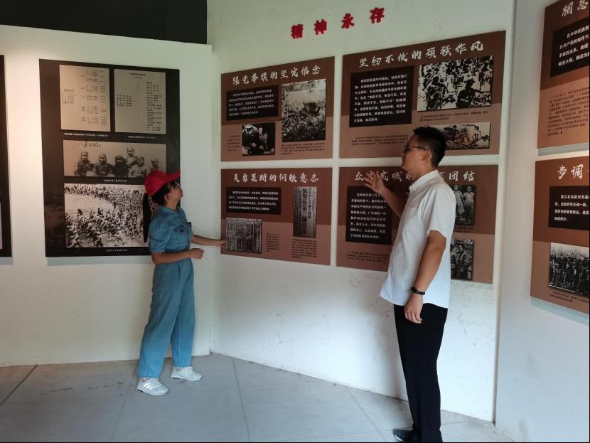 图为工作人员为实践队员介绍新四军与群众鱼水相依的场景。