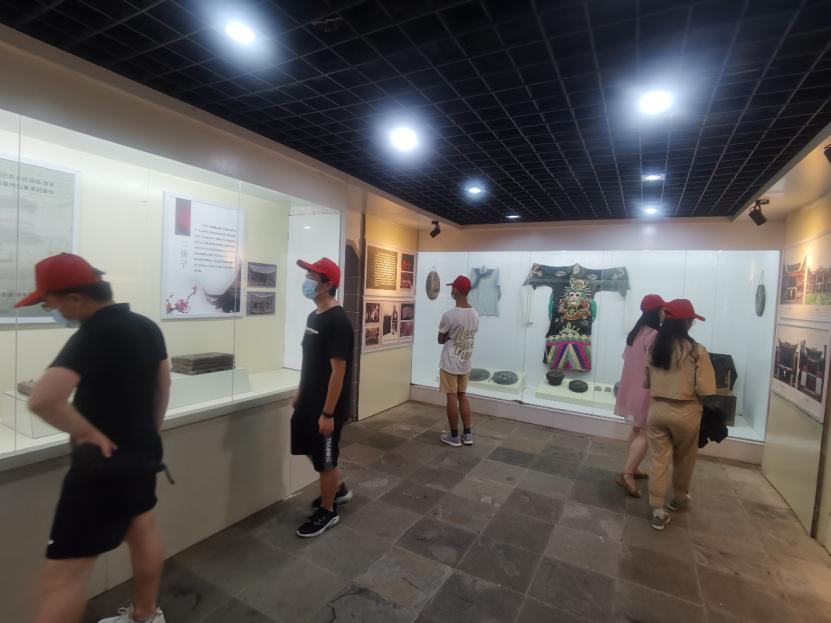 图为讲解员带领队员参观请水寨暴动时所用武器及讲解当时所发生的故事。
