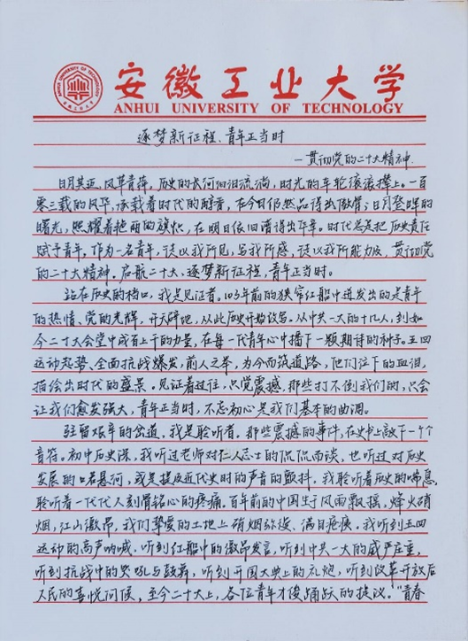 活动开展期间,同学们积极响应,纷纷用真挚的情感和独特的视角,描绘出新时代青年的风采,他们通过文字记录自己的青春故事,分享在学习、成长和奋斗中的体会与感悟。在优秀作品中,同学们或深刻剖析个人梦想与国家命运的紧密联系,或通过生动的故事展现青年一代的担当与作为。征文作品的字里行间,表达了同学们对国家和人民利益的深切关注,体现了他们积极投身国家建设和社会发展的决心。活动结束后,学院将精选部分优秀作品进行评比、展示,激励更多同学积极参与学习贯彻党的二十大精神的行动中来。
