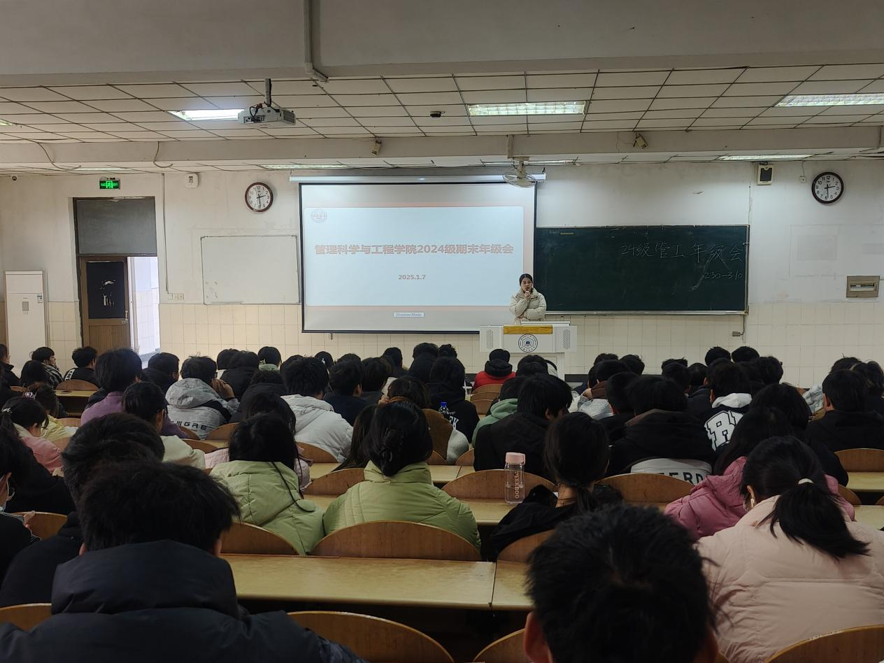 为加强考风考纪教育,助力2024级学子锚定前行坐标,妥善规划寒假生活,为学业续航、假期护航,2025年1月7日下午管工学院召开2024级期末年级会暨学风建设会。会议由2024级辅导员李军慧主持,全体学生参与。