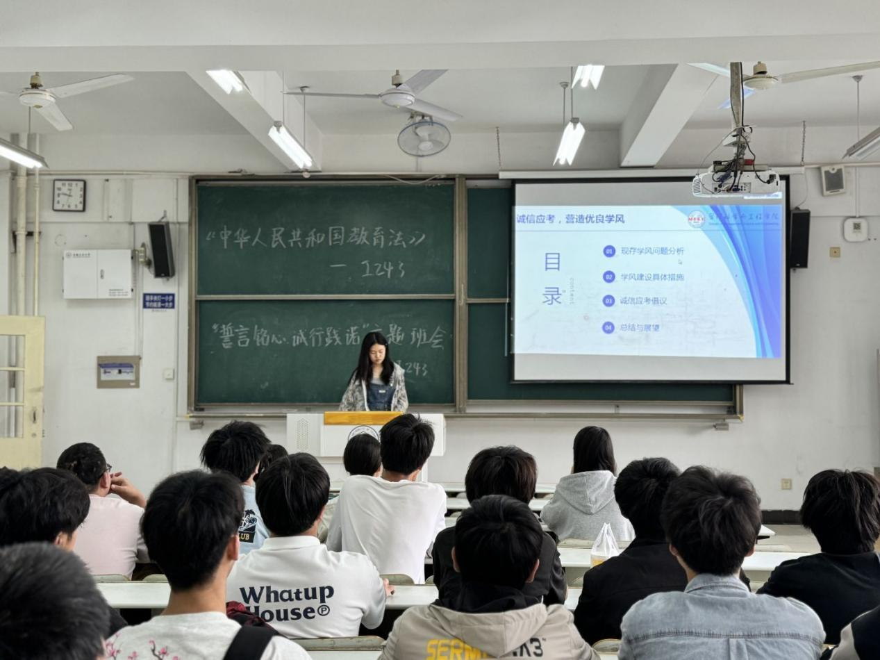 活动期间,各班学习委员通过PPT向同学们展示了当前学风存在的问题,包括“作业抄袭”“夹带小抄”“考试携带手机”等现象,以及这些行为所带来的不良影响与后果。同时,各班学委引导班级成员学习了《中华人民共和国教育法》、《普通高等学校学生管理规定》的部分章节内容,帮助同学们深入了解相关行为的法律条款,进一步强调了诚信考试的重要性。此外,部分班级通过“明辨真伪、智启诚信”知识竞赛对同学们所学知识进行了巩固与检验。会后,全体同学庄严地进行了诚信考试承诺宣誓,并签署了诚信承诺书,一致表示将通过实际行动展现自己遵守考试纪律、诚信应考的坚定决心。