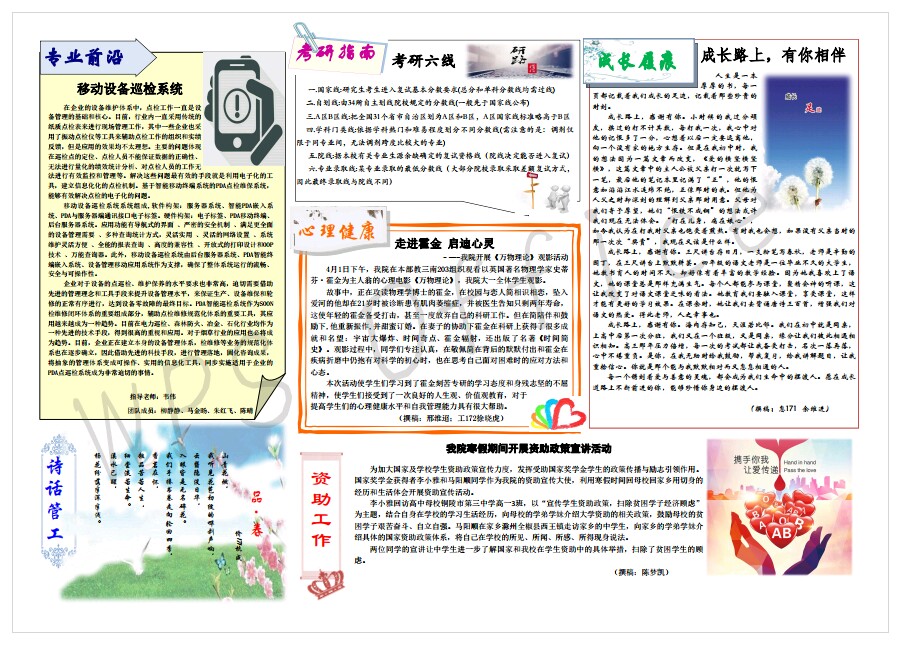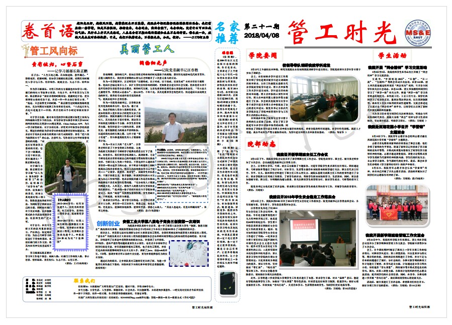 管工时光为h漫 院报宣传平台,负责学院传统媒体报纸的编辑、策划与排版,以月刊、半月刊的形式对h漫 近期重大活动事件进行综合报道,同时根据国家实事推出专刊。特设诗话管工环节,鼓励学生原创诗歌投稿,激发学生创作热情。以下为管工时光第二十一期第一、二版。