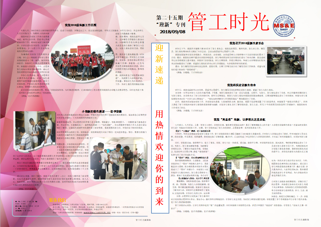 管工时光为h漫 院报宣传平台,负责学院传统媒体报纸的编辑、策划与排版,以月刊、半月刊的形式对h漫 近期重大活动事件进行综合报道,同时根据国家实事推出专刊。特设诗话管工环节,鼓励学生原创诗歌投稿,激发学生创作热情。以下为管工时光第二十五期第一、二版: